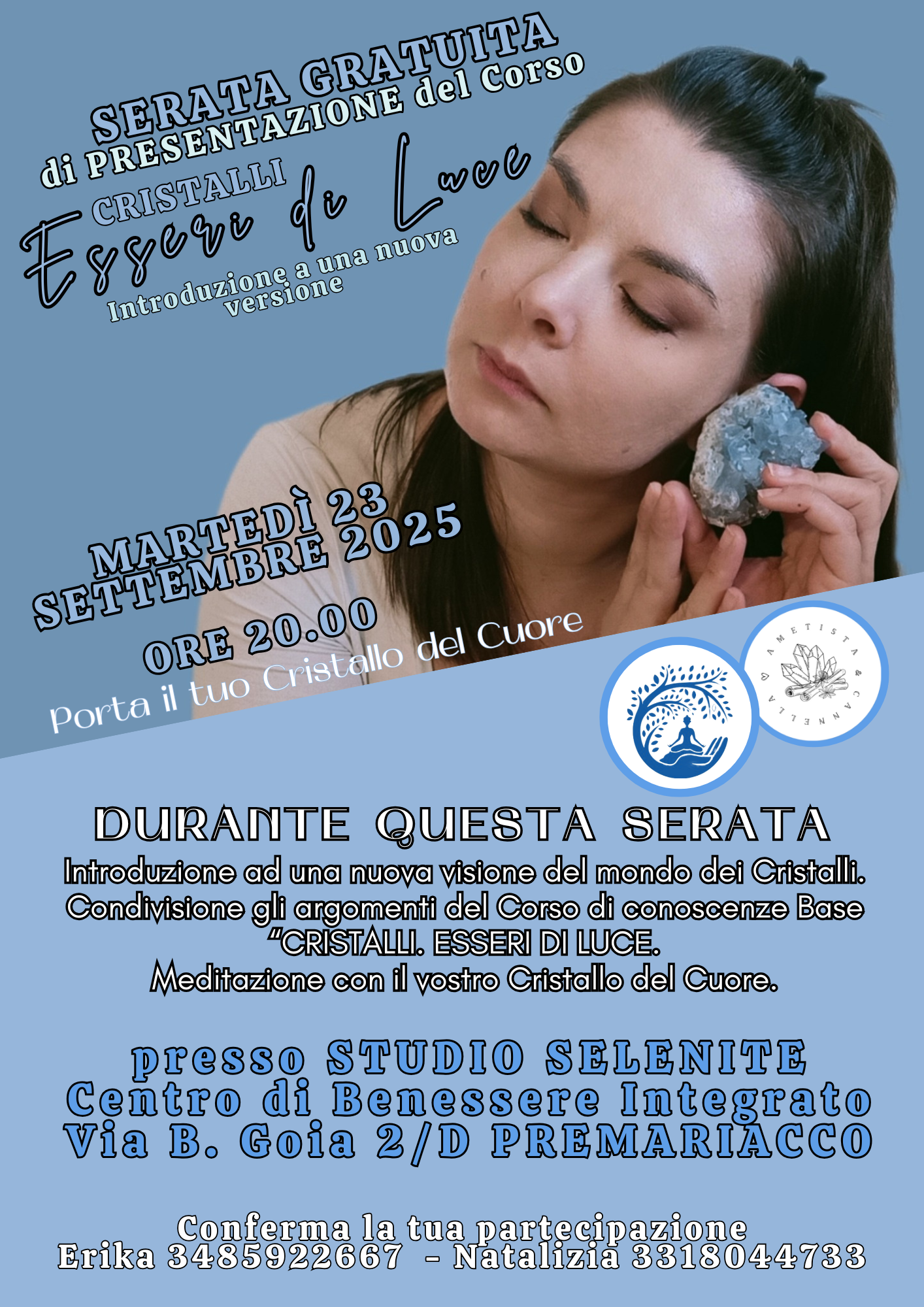 In questa serata gratuita io e Natalizia, custode di un meraviglioso spazio di serenità e pace a Premariacco (Udine), avremo il piacere di presentare il mio Corso di conoscenze base "Cristalli. Esseri di Luce. Introduzione a una nuova visione" che porterò nel suo studio DOMENICA 12 OTTOBRE 2025.